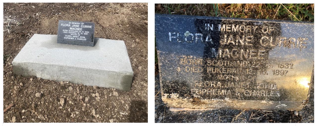 We are pleased to report the completion of the restoration and relaying of Flora Macnee’s headstone. Donations from Flora’s descendants have covered the costs involved. The Gore District Council will level the ground around the headstone and plant grass in conjunction with other planned work at Pukerau Cemetery.