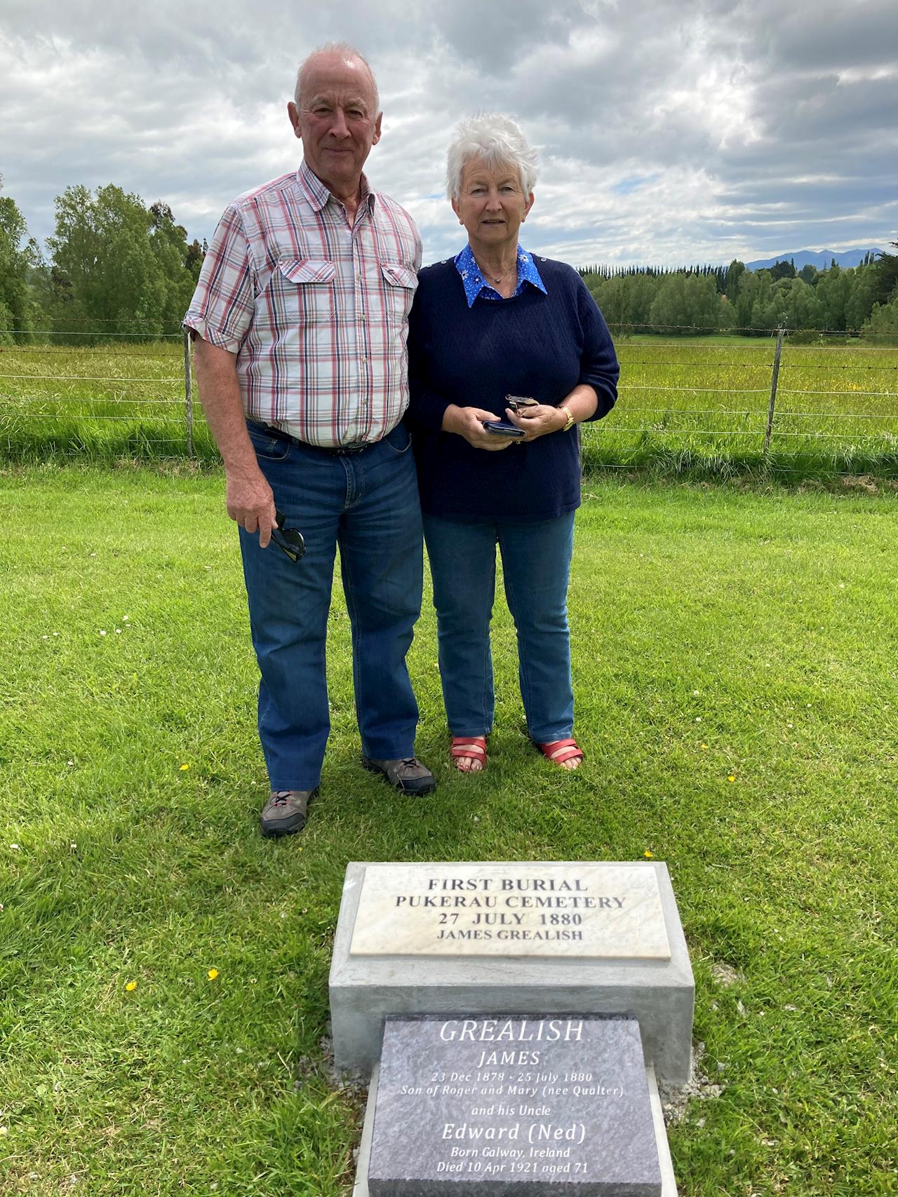 The Pukerau Cemetery Support Group are delighted to report that they have made contact with Rodger and Jean’s grandson – Robin Grealish - who has given permission to mark the grave, where his great-great-uncle, Edward Grealish (who died a Bachelor), is also buried. On 7th March 2020, Rodger visited the Cemetery with his wife Jill - who is a descendant of the Rev William Fisher Craigie - whose first wife is also buried at Pukerau.