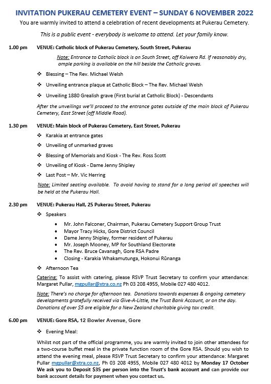 We aim to start the event at 1 pm at Pukerau Cemetery with blessings first at the Catholic Block, then at the main entrance, opening the kiosk, and viewing the improvements before adjourning to Pukerau Hall for speeches and afternoon tea. Further information will follow as arrangements fall into place.