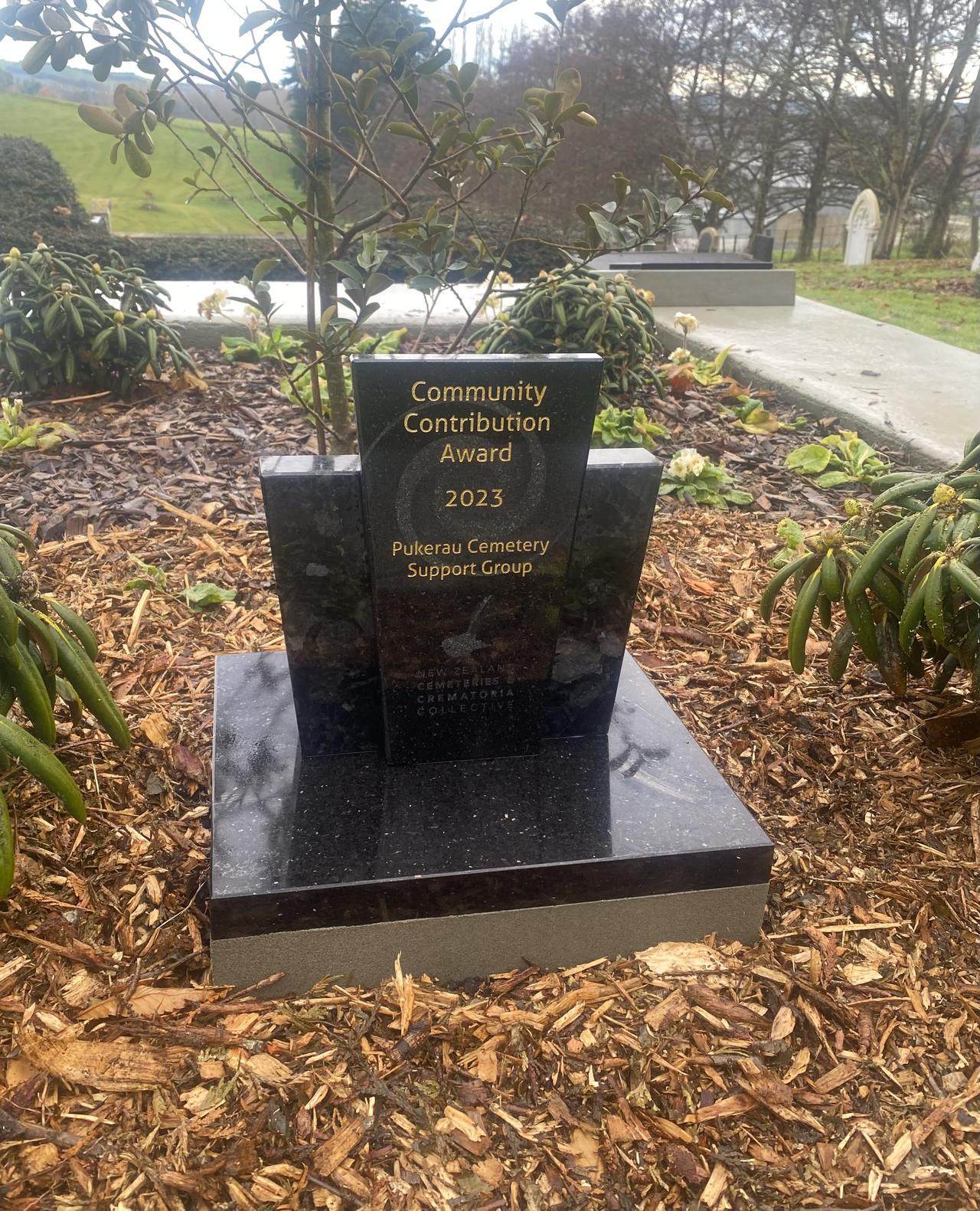 The New Zealand Cemeteries and Crematoria Collective (NZCCC) 2023 Community Contribution Award - given to the Pukerau Cemetery Support Group in recognition of their significant impact on the community through their work - was installed at the Cemetery this week. It is on a small granite base in the ashes beam.
