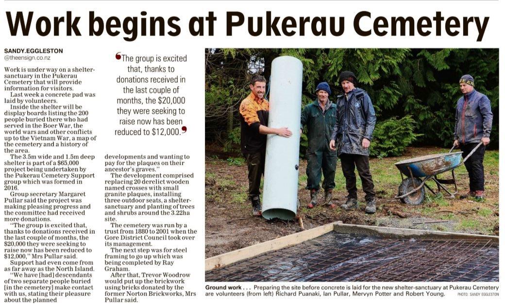 29 May 2019Great article in today's Ensign re the work at the Cemetery last week. The fundraising goal is now $12,000 with a number of individual donations and pledges, a $3000 grant from the Gore RSA, and the generous donation of time & materials from Richard Puanaki, Ian Pullar, Mervyn Potter and Robert Young. Contact Margaret Pullar, Secretary, for more information.