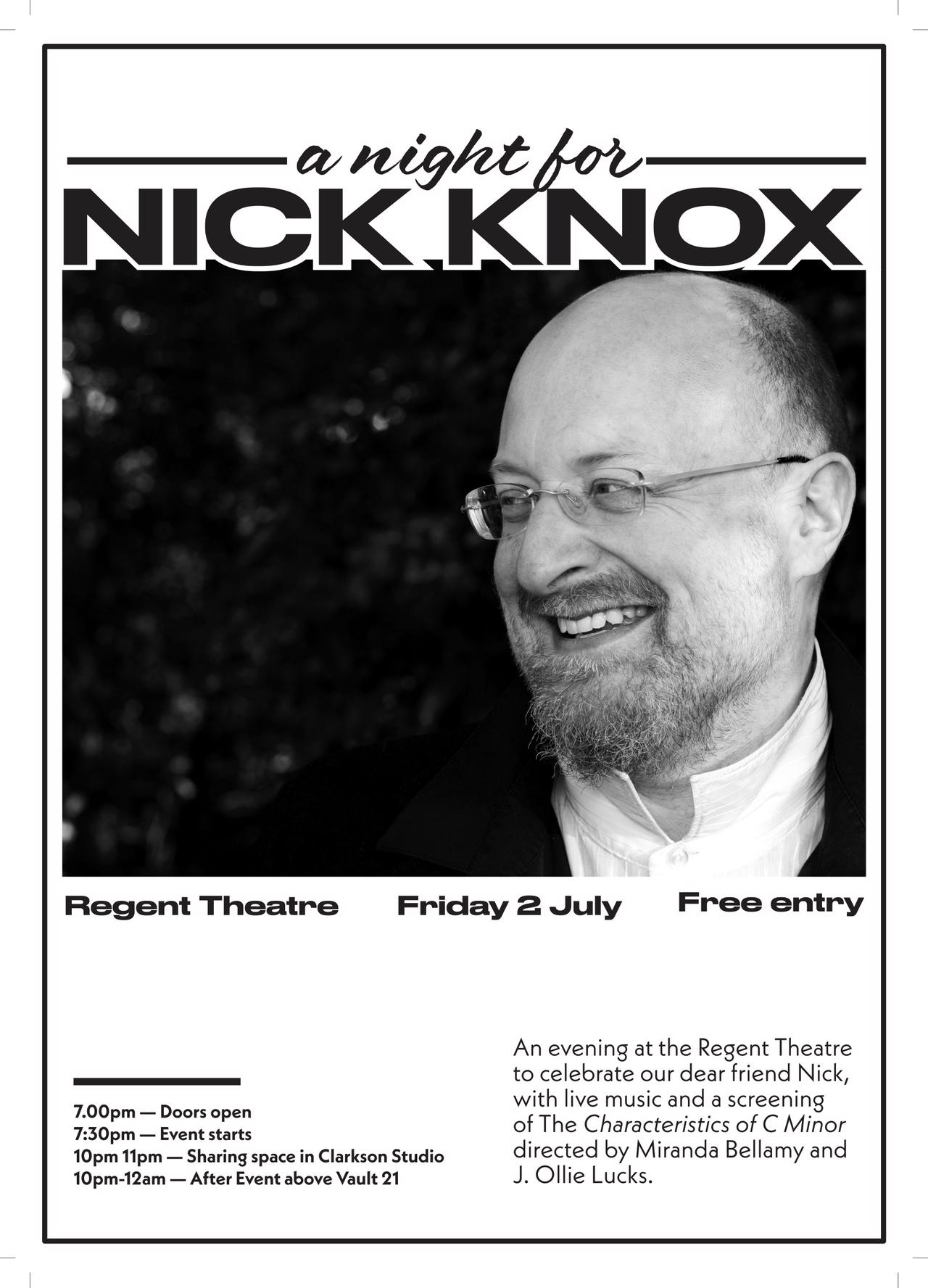 Live Music and a screening of “The Characteristics of C Minor” directed by Miranda Bellamy and J Ollie Lucks will pay tribute to Nick at the beautiful Regent Theatre on Friday 2nd July.