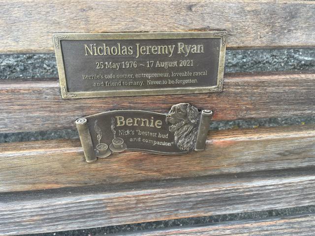 He wasn't perfect & never claimed to be. Real people aren't. Nick had his troubles & finally succumbed to them in August 2021. We would like to have a place to remember Nick & have chosen a bench with 2 brass plaques by the children's playground, Oriental Bay; one for Nick & the other for his bestest bud & companion, Bernie, Nick's Bernese mountain dog who was also the namesake of Nick's cafe, Bernies on the Bay, at Freyberg Pool, Wellington.