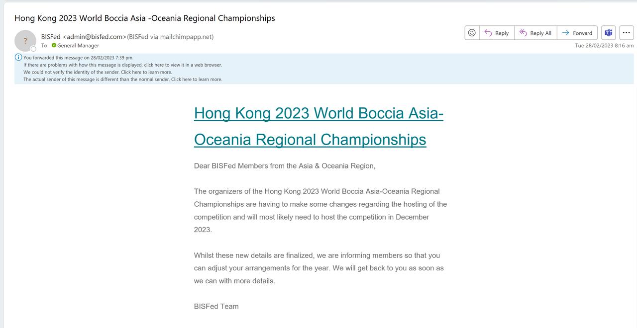 This is an update to inform supporters of a change of date for the Hong Kong 2023 World Boccia Asia-Oceania Regional Championships. This event has been moved from May 2023, and will now be delivered in December 2023 (please see screenshotted email confirmation of this change).