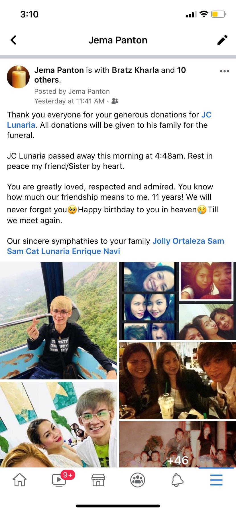 We are very grateful to all the generous donors.JC Lunaria passed away yesterday morning and on behalf of the Lunaria family thank you all.