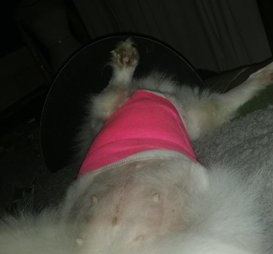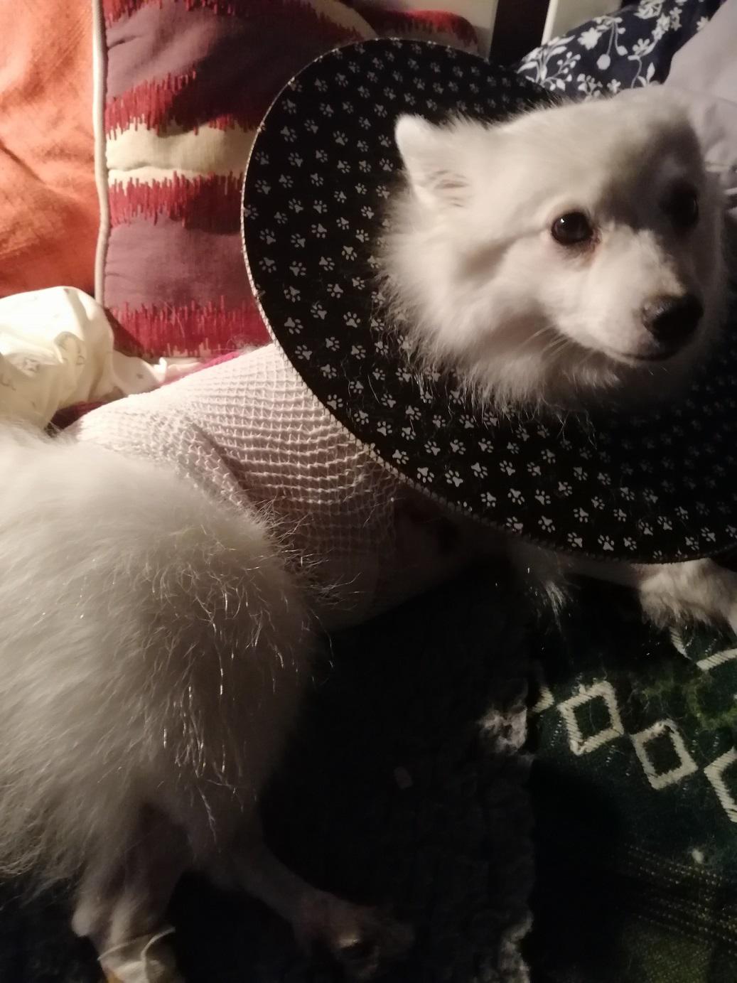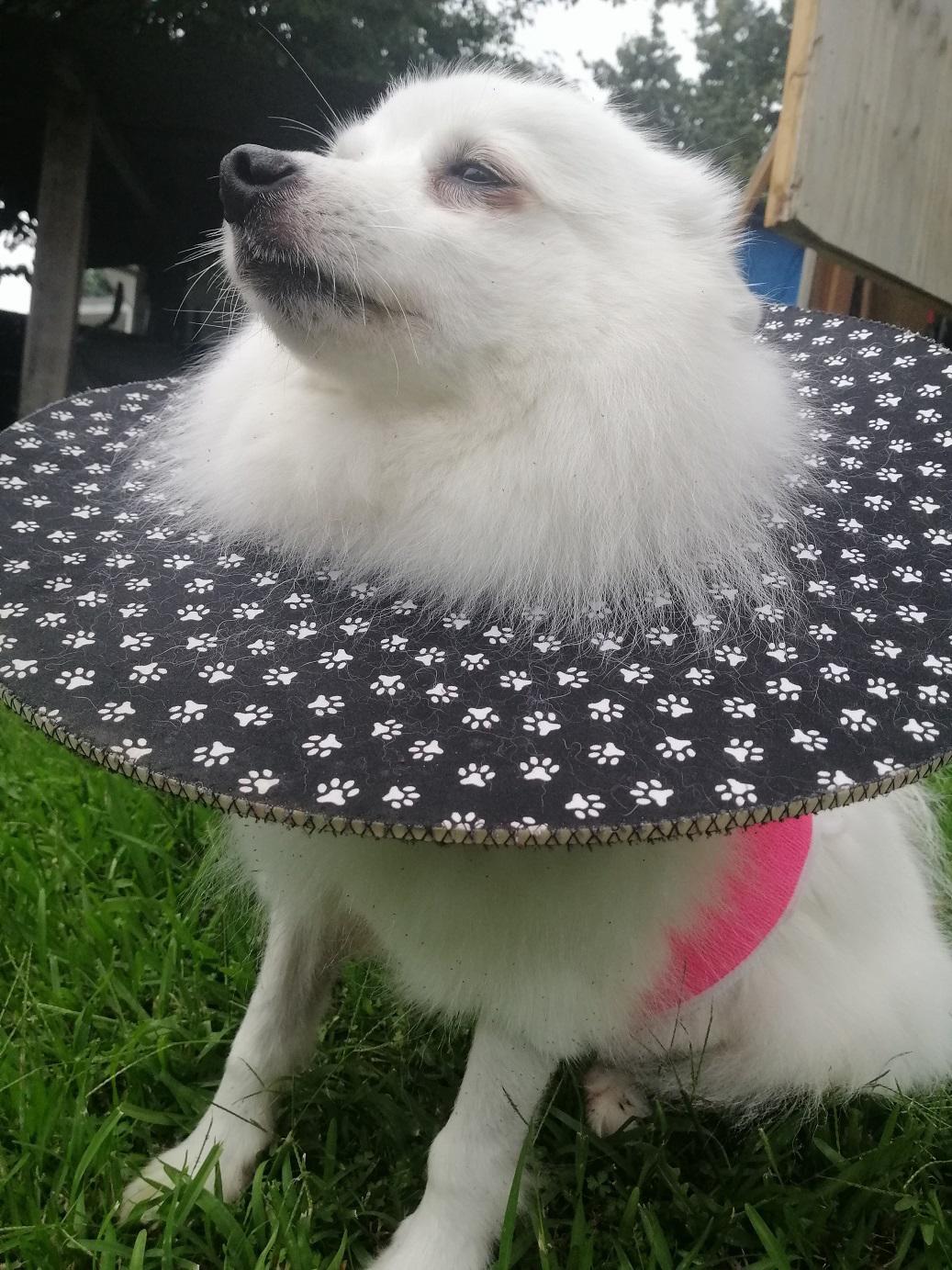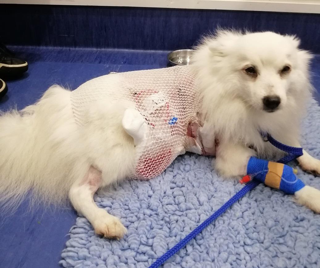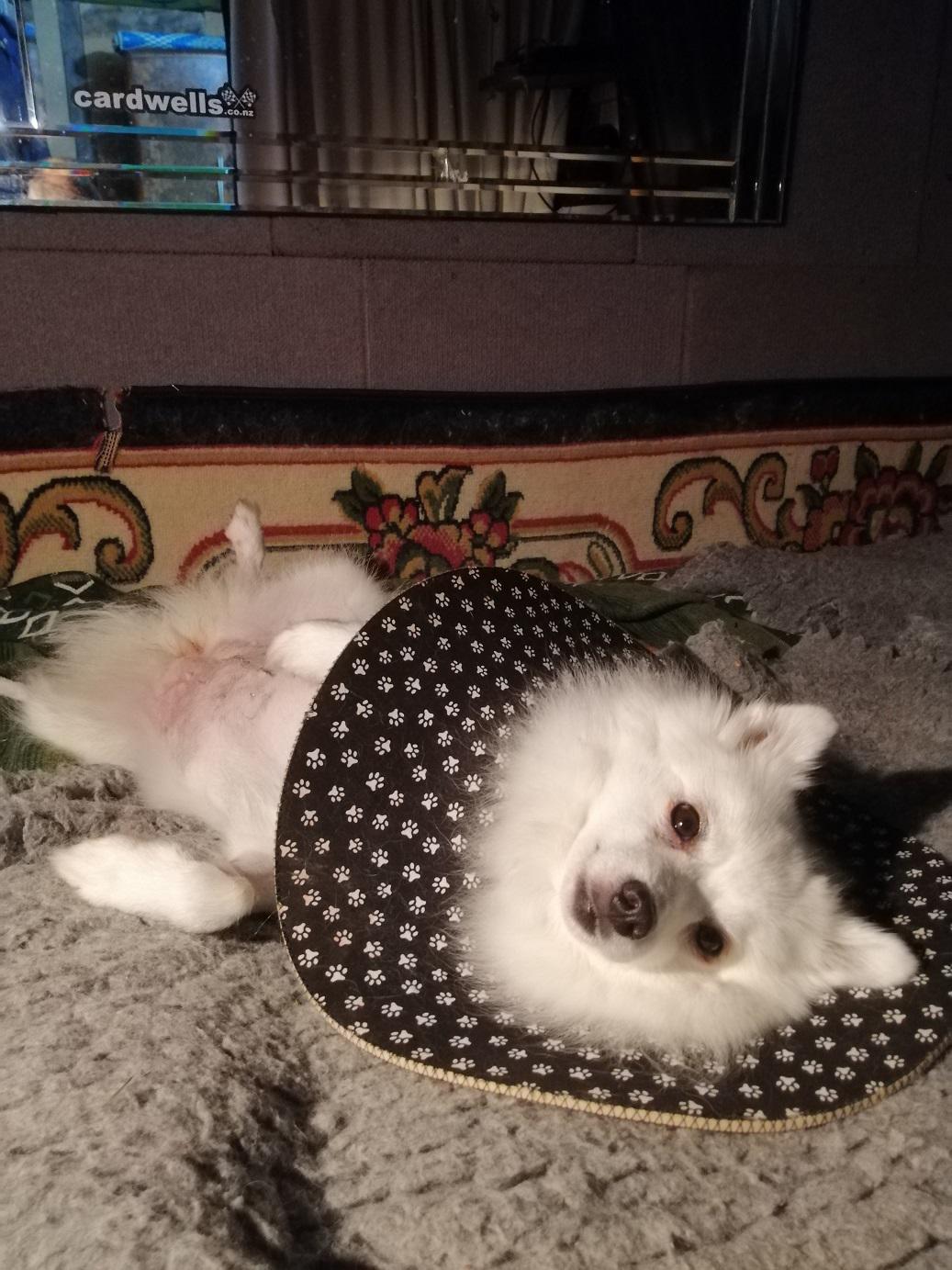 Asked the vet if my use of a coat had added to the problem but she thought not. Told me that the crushing action (combined with shaking) of a dog bite means that the skin often looks OK at the time of suturing but can become necrotic later. She still has one more area of blackened skin (around the bite that went through her back into rib-cage) but it shows no sign of lifting yet = ‘fingers crossed’ for that one to have better healing underneath.