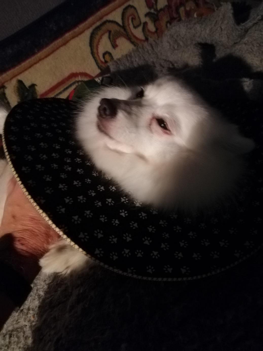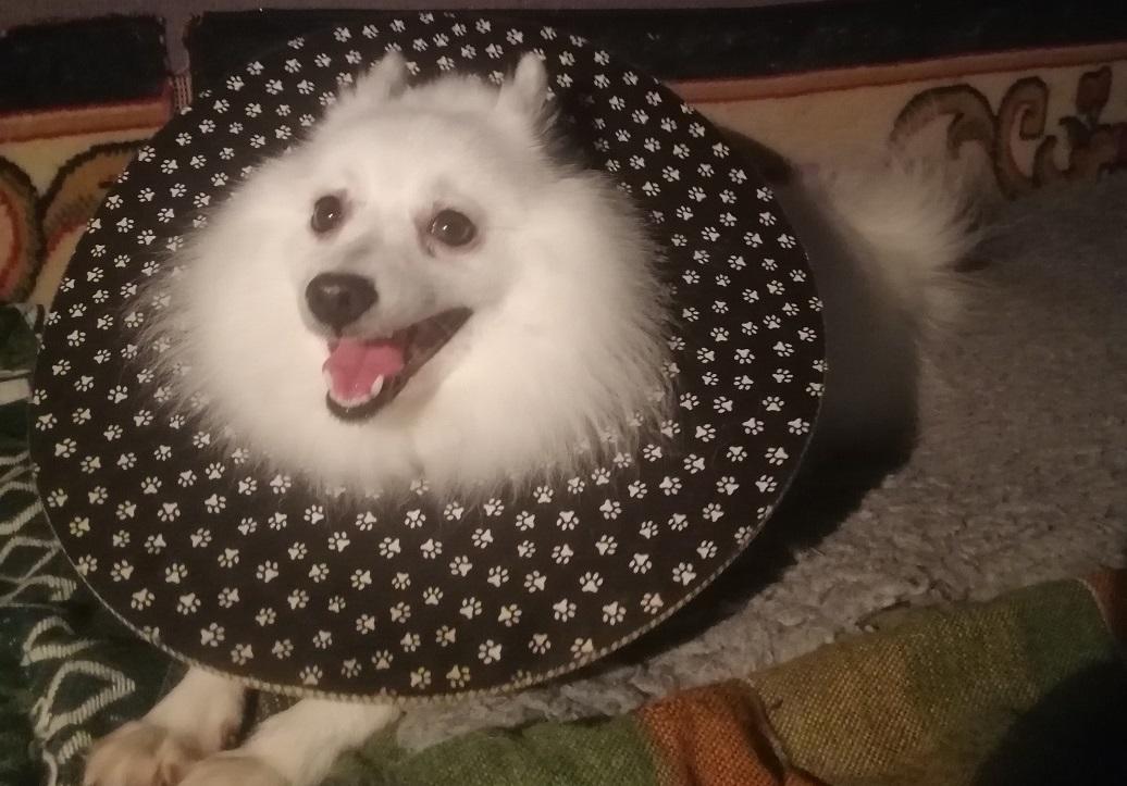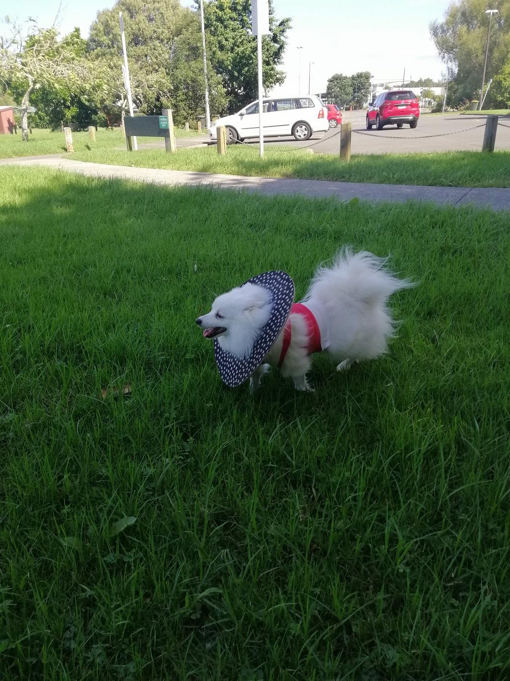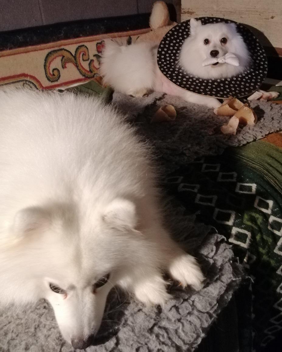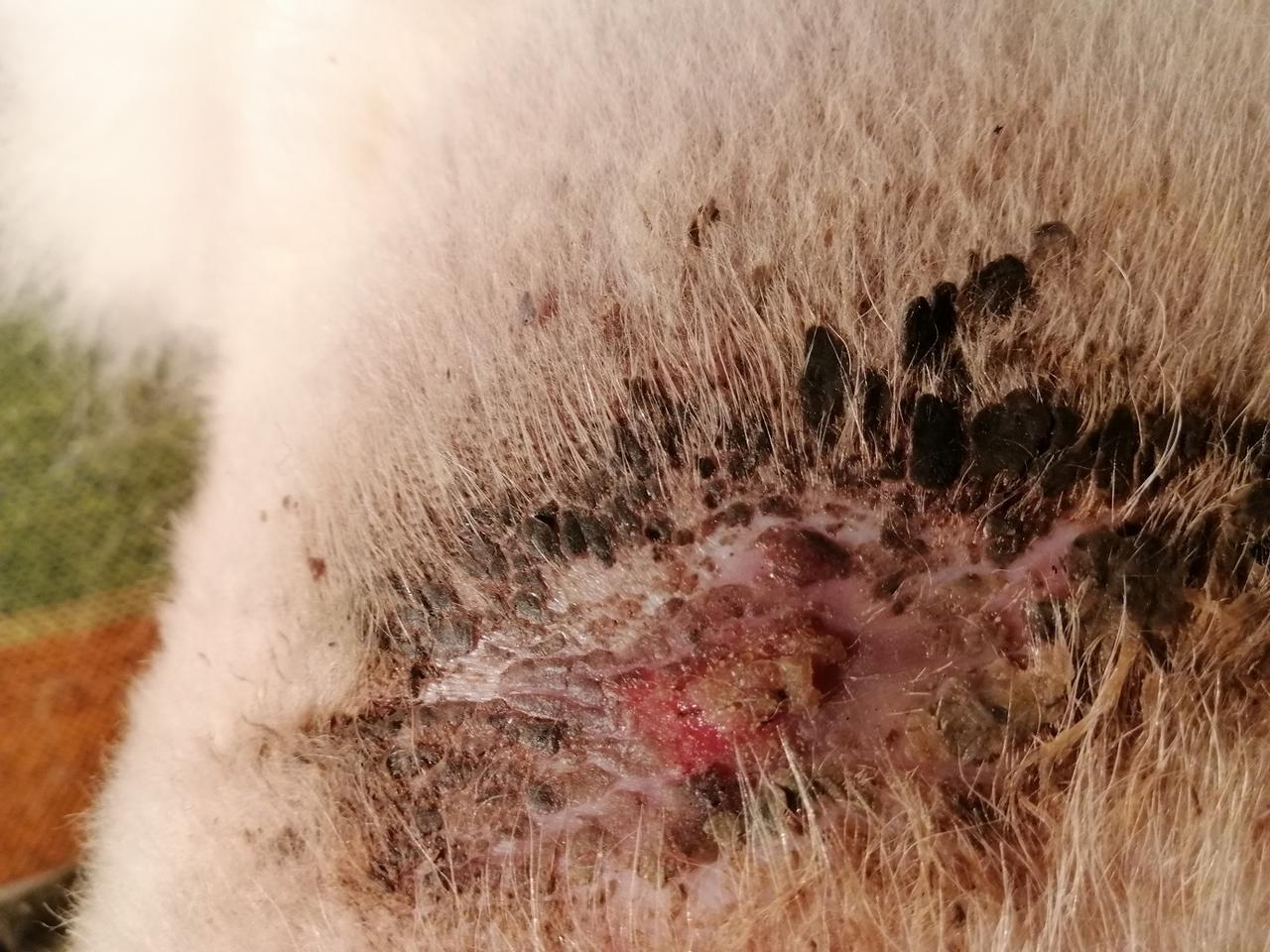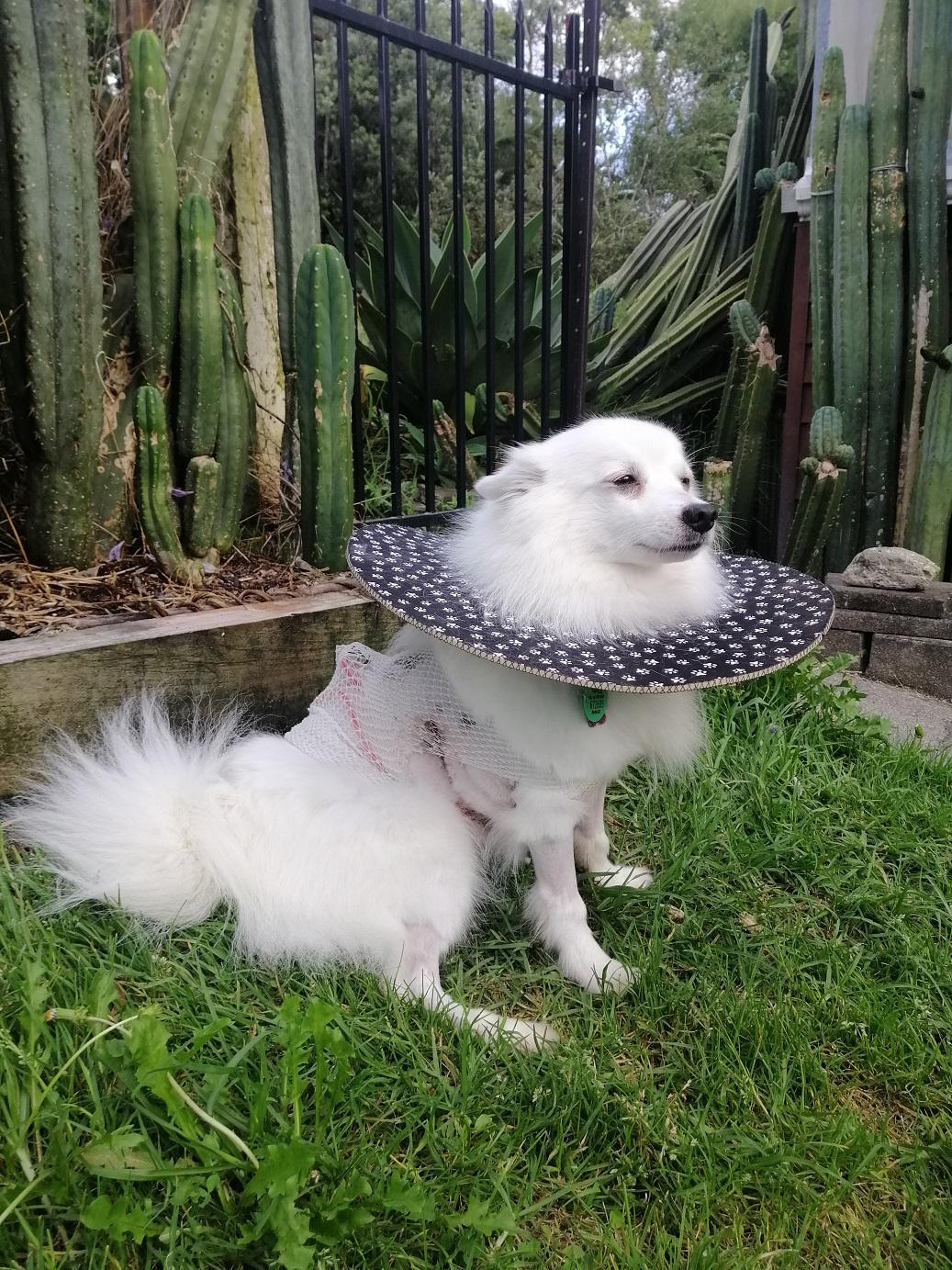 Asked the vet if my use of a coat had added to the problem but she thought not. Told me that the crushing action (combined with shaking) of a dog bite means that the skin often looks OK at the time of suturing but can become necrotic later. She still has one more area of blackened skin (around the bite that went through her back into rib-cage) but it shows no sign of lifting yet = ‘fingers crossed’ for that one to have better healing underneath.