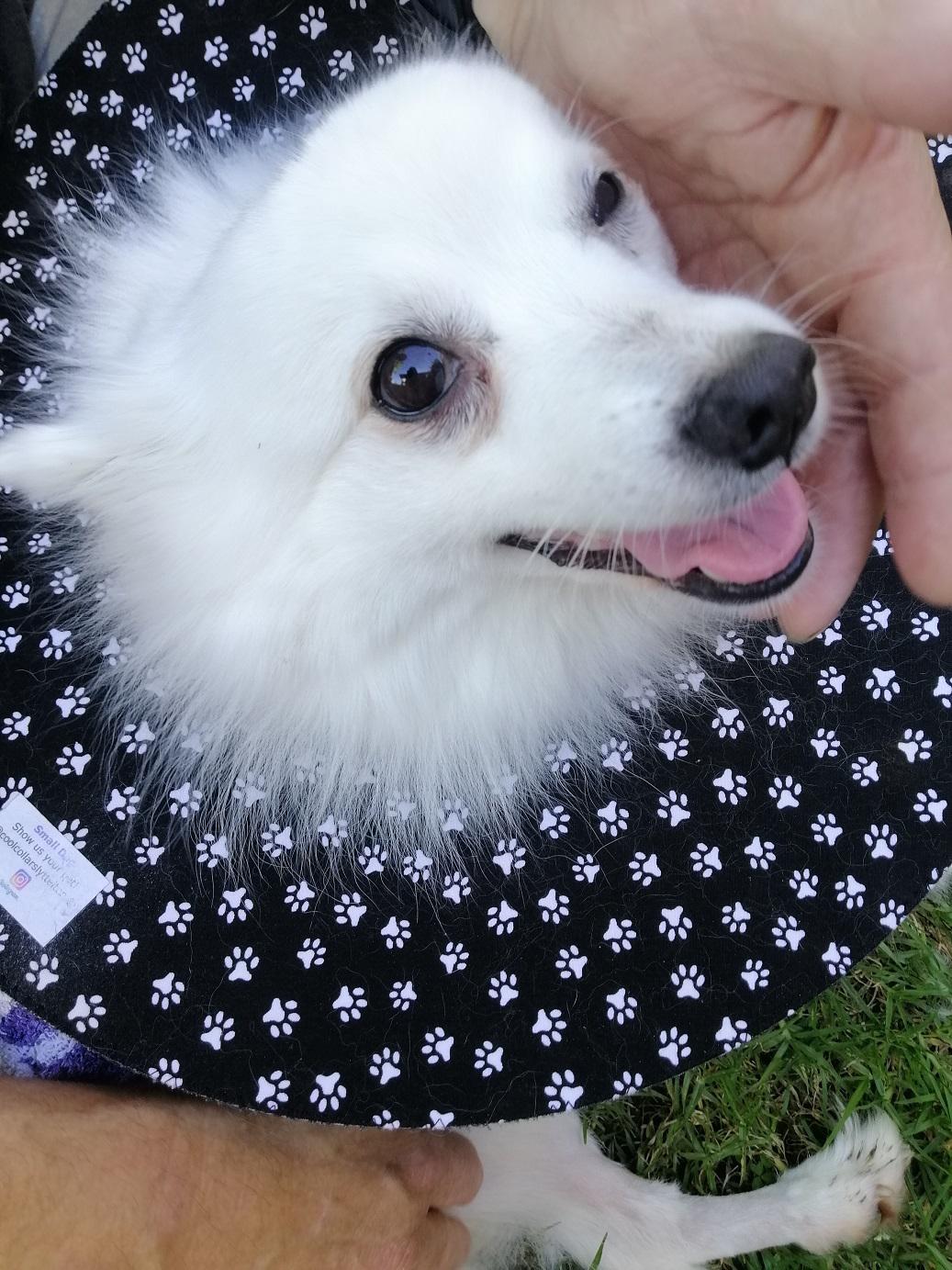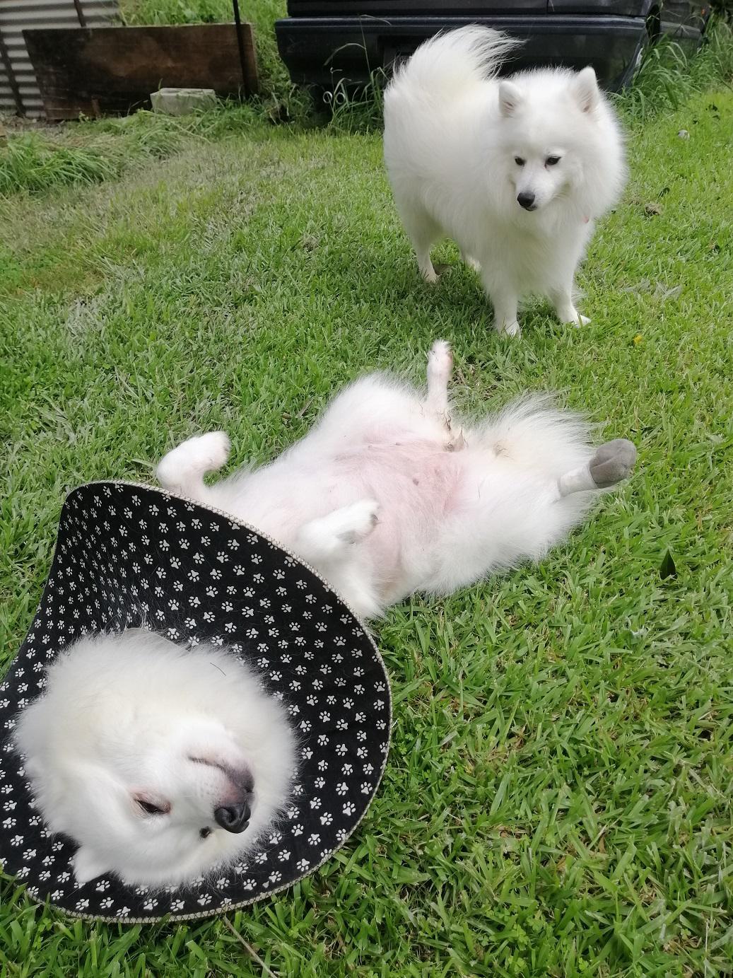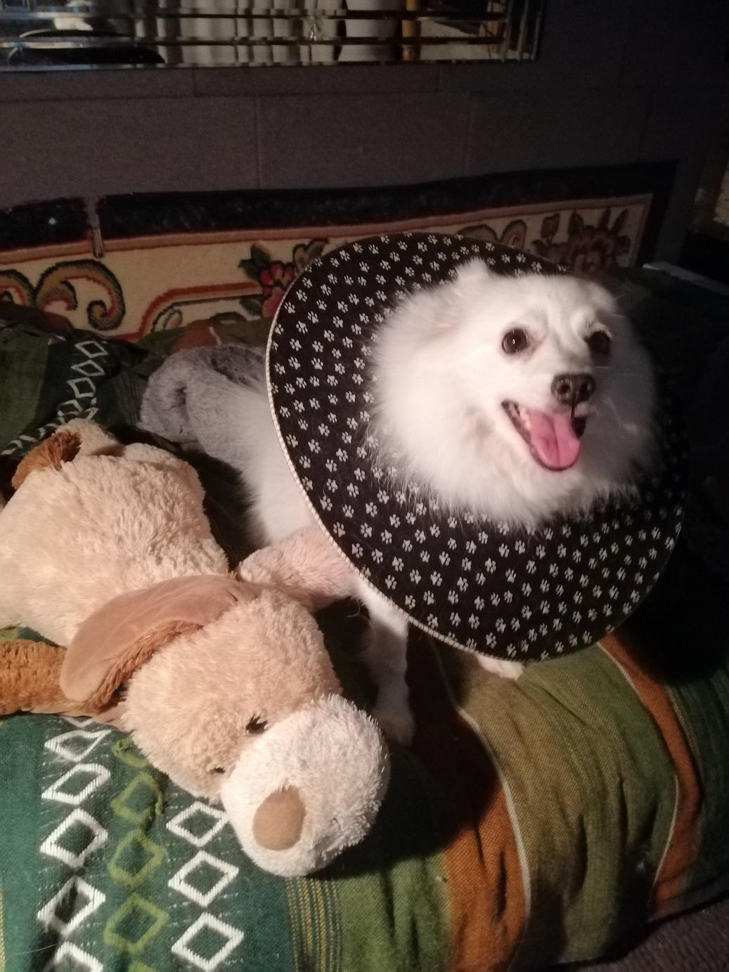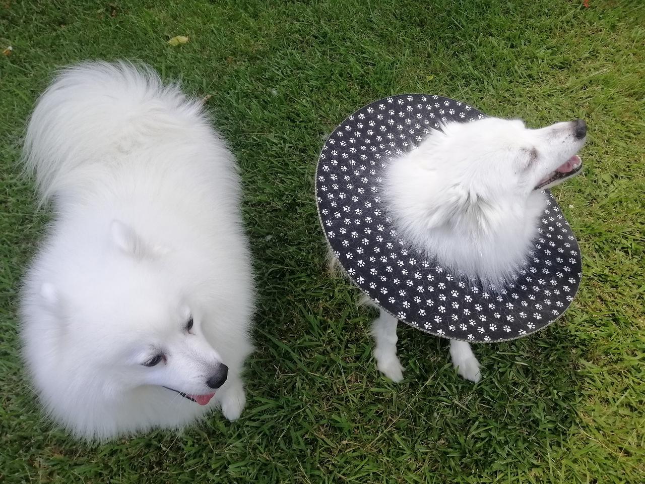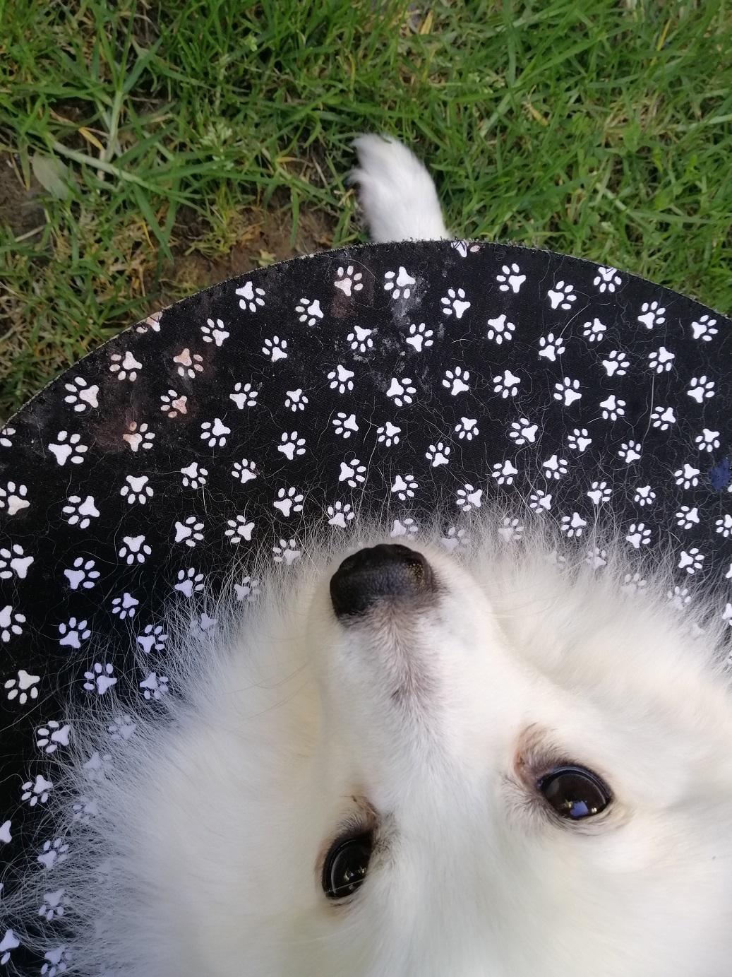 Asked the vet if my use of a coat had added to the problem but she thought not. Told me that the crushing action (combined with shaking) of a dog bite means that the skin often looks OK at the time of suturing but can become necrotic later. She still has one more area of blackened skin (around the bite that went through her back into rib-cage) but it shows no sign of lifting yet = ‘fingers crossed’ for that one to have better healing underneath.