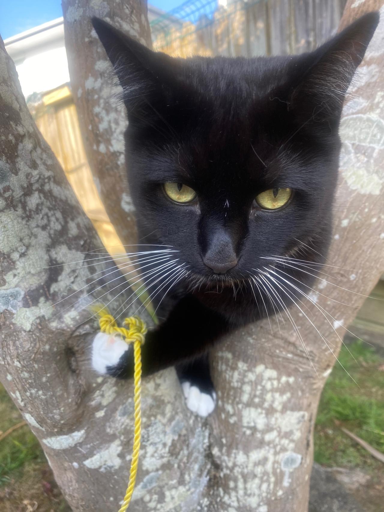 Leo climbs that tree like a pro. We have put netting around the tree, so they can't climb too high, and jump on the neighbour's roof!