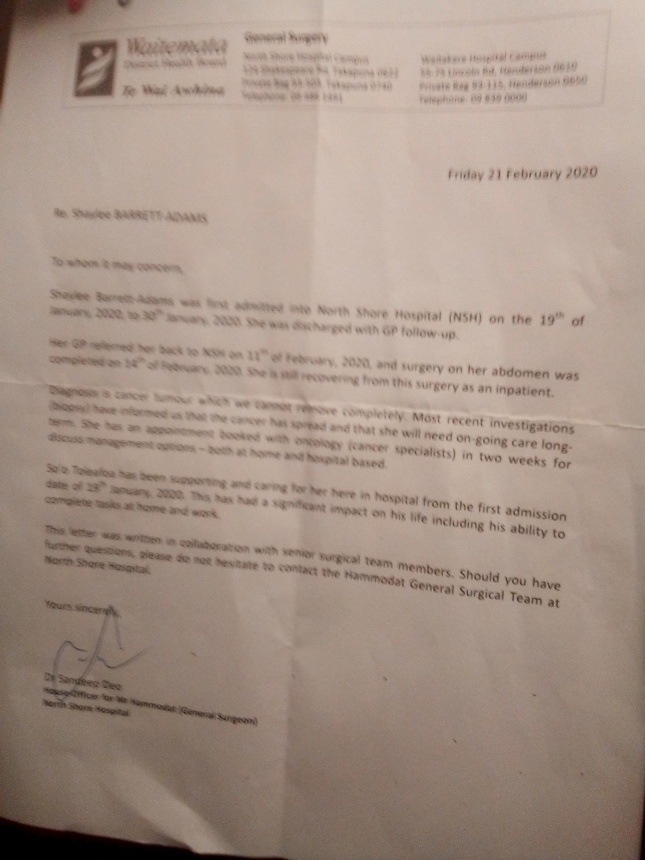I live at 16 Thalia place totara Vale North shore Auckland my name is Haley Adams I was born on the 4th of the 11th 1983 my licence number is de91 3938. I had an operation on the 14th of February and to see how advanced the tumor is and it's attached itself to organs that they cannot cut because it will kill me so they had to leave it in there so I'm still healing from the surgery and say have an oncology meeting for me in middlemore hospital for ongoing treatment such as radiation therapy.they have advised me that the chemo is not going to cure the cancer because the cancer cells are in my blood and modes and things like that.