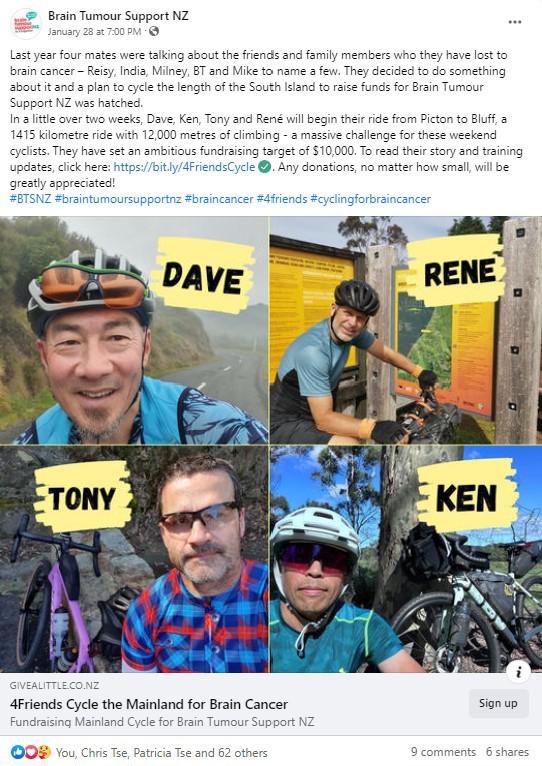 For those that are currently going through the challenges of a brain tumour, we remain humbled by your stories of strength and courage, and we will be cheering you on as you fight your battle in the future. Kia Kaha.