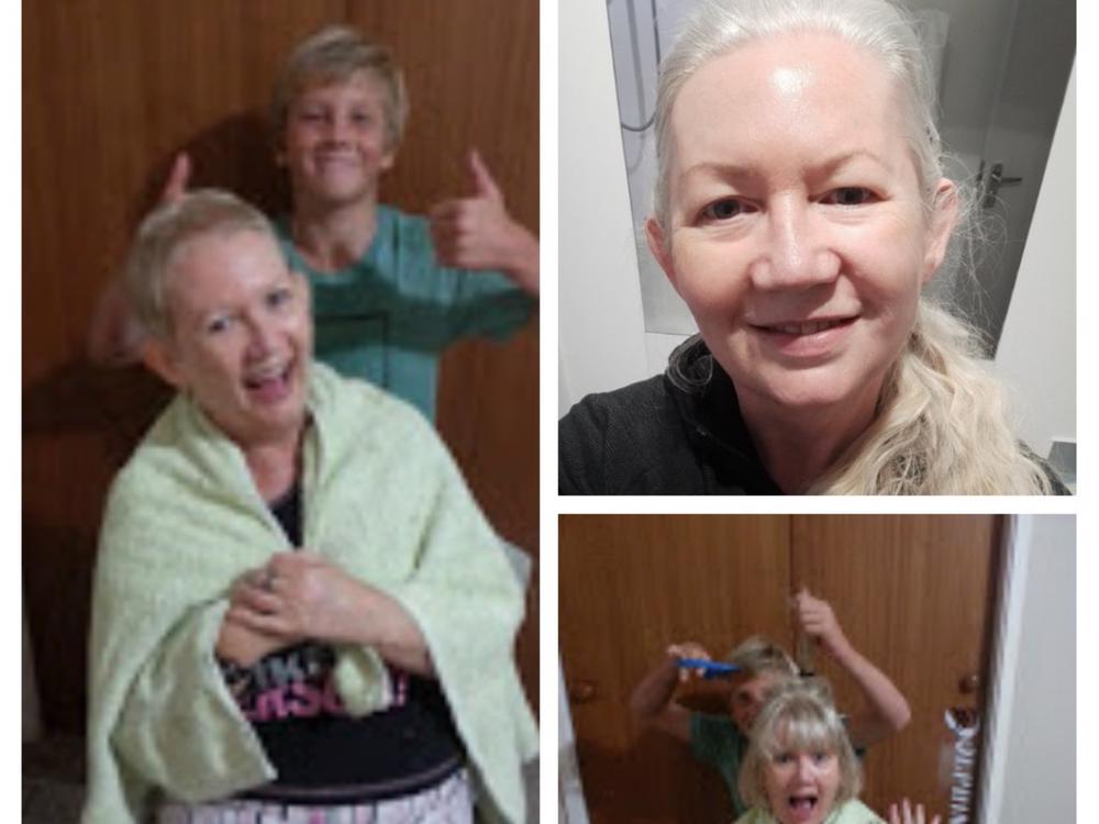 The images show my nephew cutting my hair in 2016 during chemo and how long my hair is now