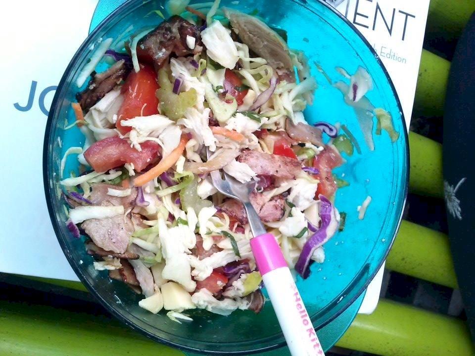 Lean meat, fruit and vege, eggs and the like are all still fine - so chicken salad seemed safe. I actually used bagged coleslaw where you add the dressing yourself... but seeing as the dressing had added sugar in it, I left that out. After I popped in a bit of cheese, tomato, and some more carrot, I threw in the chicken! I'm not gonna lie. It seemed dry and boring. Soooo, to shake things up a bit I added lemon juice.