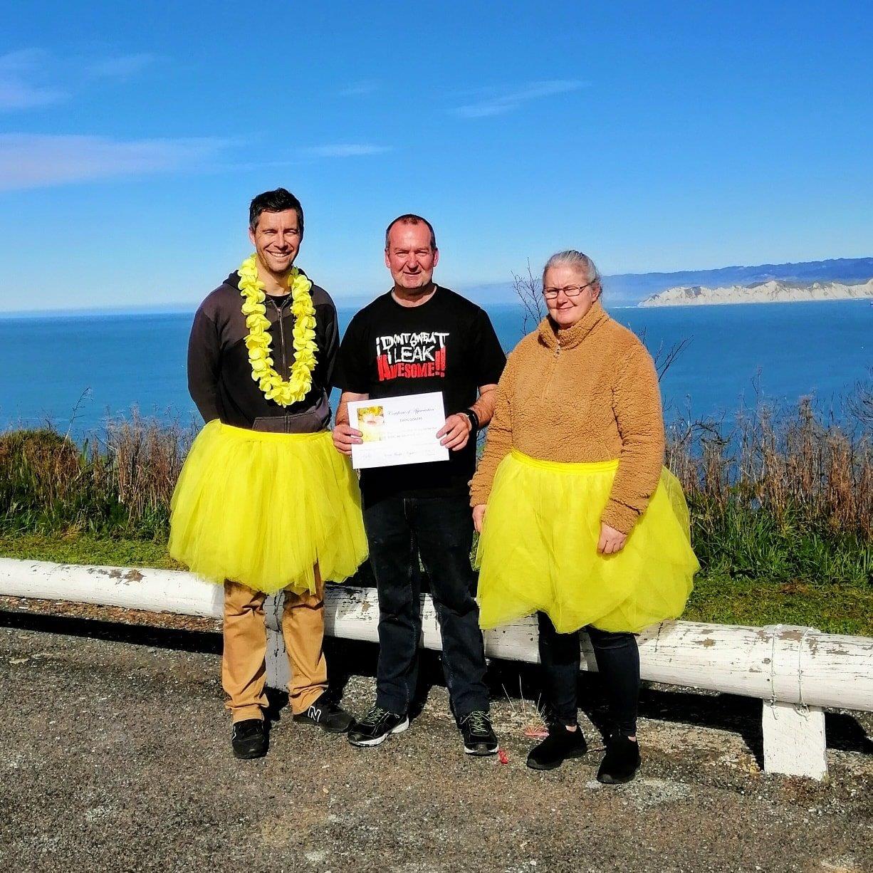 Radio presenter Bevan from More FM doned on a tutu in support of Daryl at the top of Kaiti Hill on 4 August 2020. Bevan joined Daryl, Daryl's partner Shelly and the team at the Cancer Society with a surprise morning tea as a THANK YOU to Daryl and all his fundraising efforts.