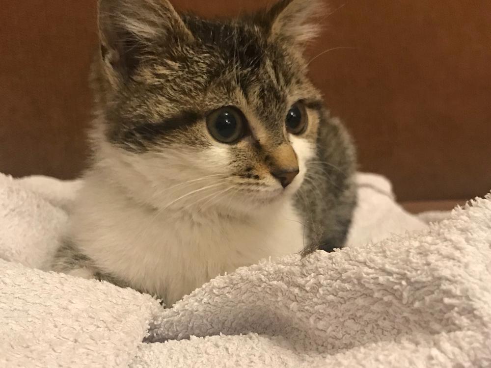 Wednesday the 28th of July my son was walking up our driveway and noticed a kitten run under our house. A trap was set and a little white tabby kitten caught. She had some food and the night to relax before we handled her. On Friday we noticed an issue with her standing and took her to VetCare in Greytown. She had a high temperature and she was given antibiotics, cream for the stumpy leg and fluids. She came home to recover over the weekend. On Monday she was taken to vet care Masterton to be assessed by Heidi the vet and a plan of action for her recovery. Her stump was inspected, the fur trimmed and pet putty applied to the wound.