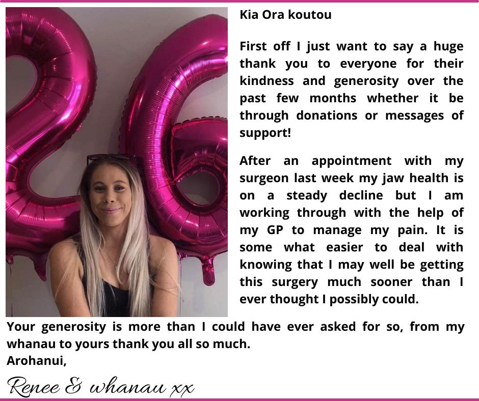 5 November 2021As of today we have $40,000 in Renee’s Surgery Account including both Givealittle and Renee’s surgery bank account. That has only been possible with your generosity, sharing Renee’s story and being part of her journey in some way. The cycle to Bluff took many turns along the inland route with snow, head winds, 1 puncture and some narrow roads with big trucks, but every pedal was worth it. Thank you from Renee’s family, our family and a huge hug and thanks from Renee. This isn’t the end of our fundraising journey it is just the beginning until we make surgery a reality for this 26 year old young woman. Renee’s parents and whanau, Christine and I really appreciate the support you have given Renee. Nuk