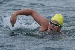 The next km was OK then it got tough for some reason, the wakes from the skiers had an effect and we hit a patch that was not protected from the gentle breeze that was blowing into my face. I kept looking for the finish, Wayne told me that it was around the next corner, he also told Andrew there was a couple of miles to go, he didn’t tell me that, that was about 1 hour 45 minutes swimming at the pace I was going. On reflection I am glad he didn’t tell me that. He suggested I try to catch a woman in a wet suit who had been just ahead of me for the last 4 hours, so I put my head down and put in the hard work, one stroke at a time. A couple more feed stops and then he told me my sister Jaki was on the shore, so I stopped and wave to her and knew the finish was not far away.