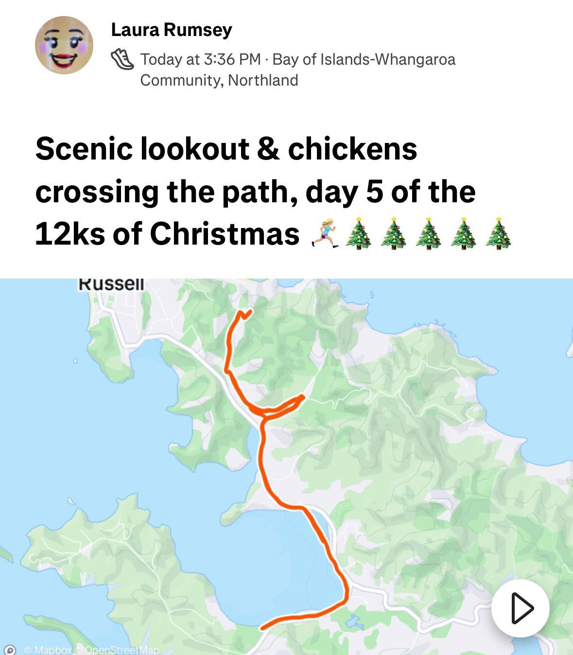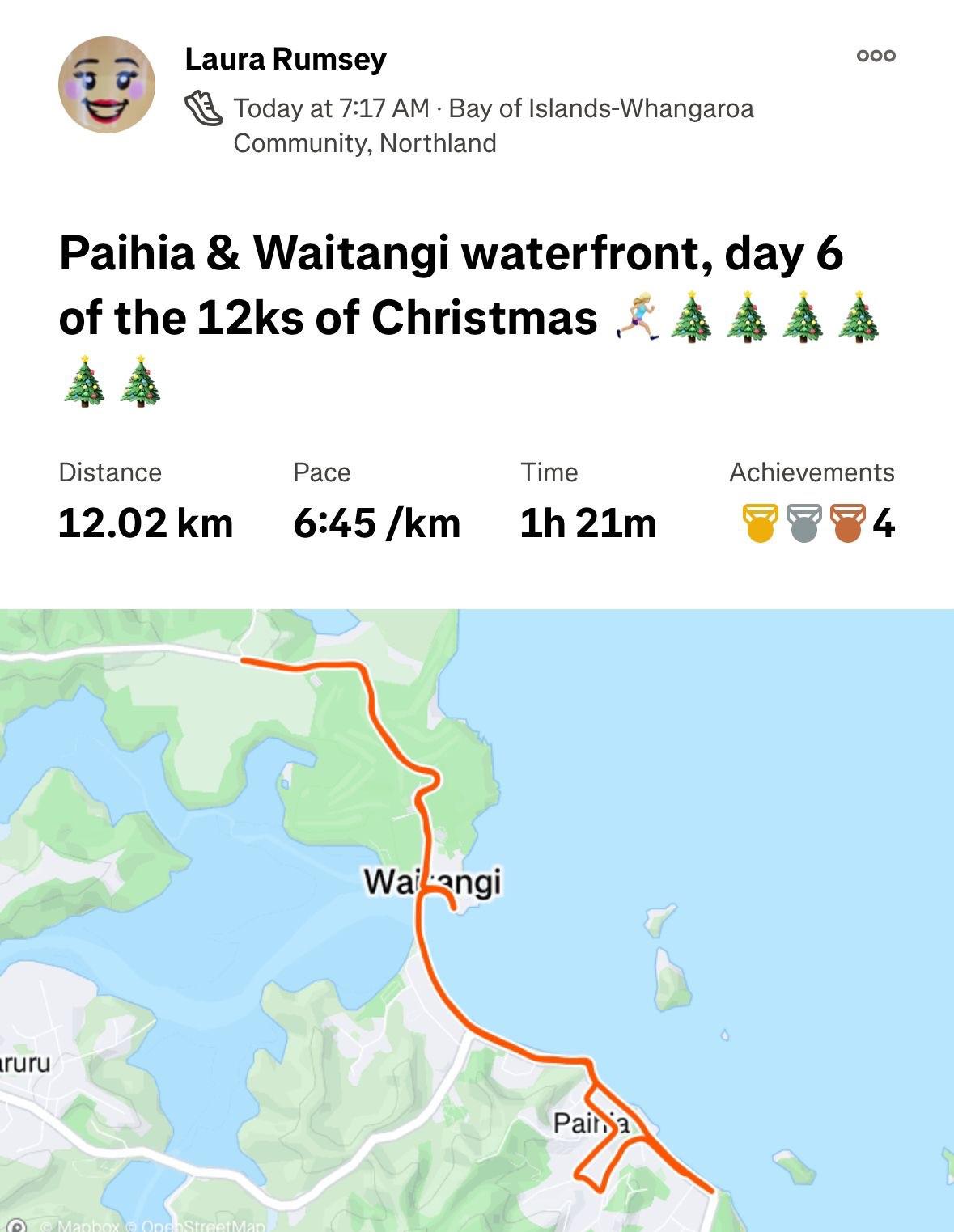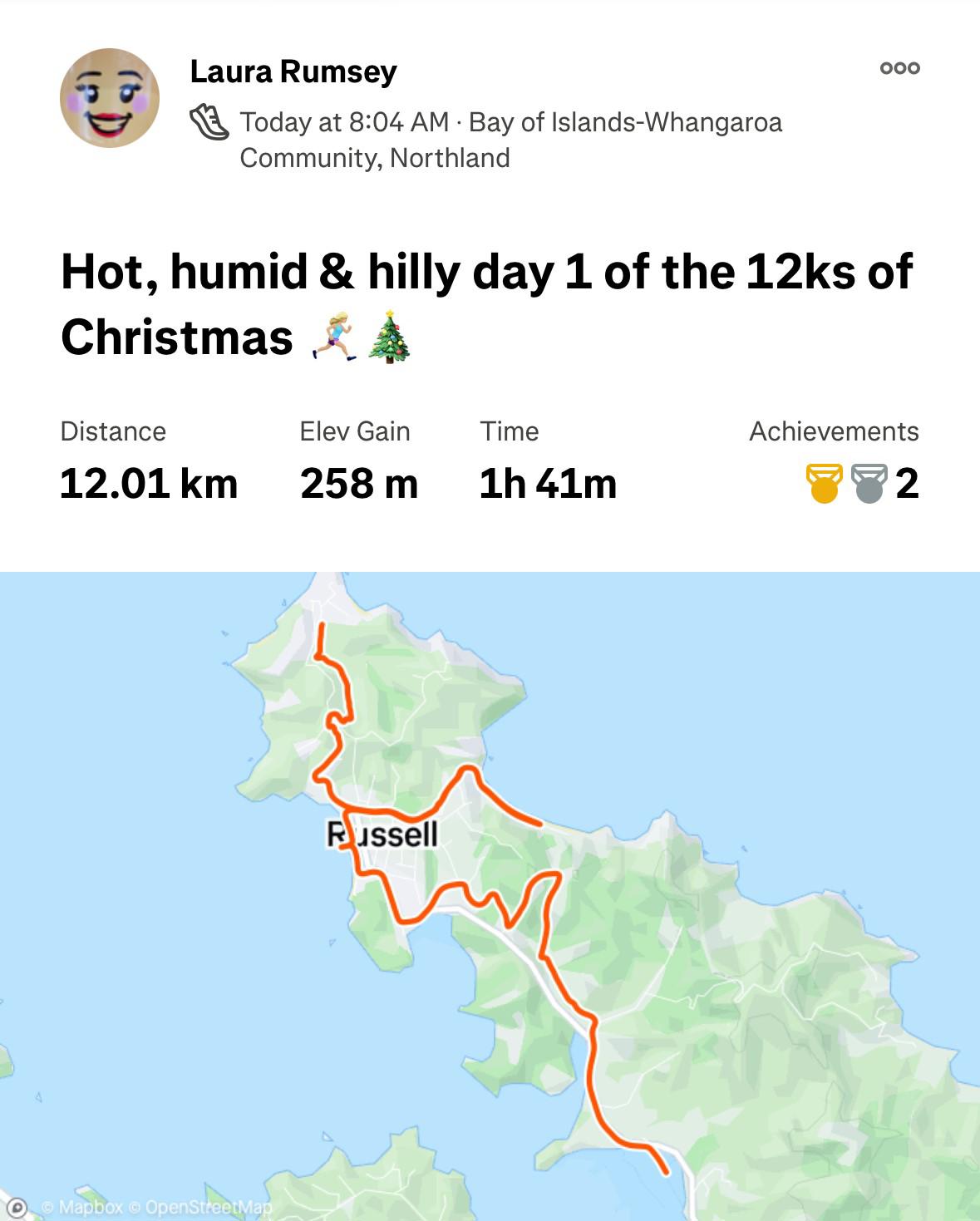 Today saw Laura and Alex running in Auckland, William walking some hills in Russell and finishing up with the Russell Christmas Parade. Meri Kirihimete. 🎄