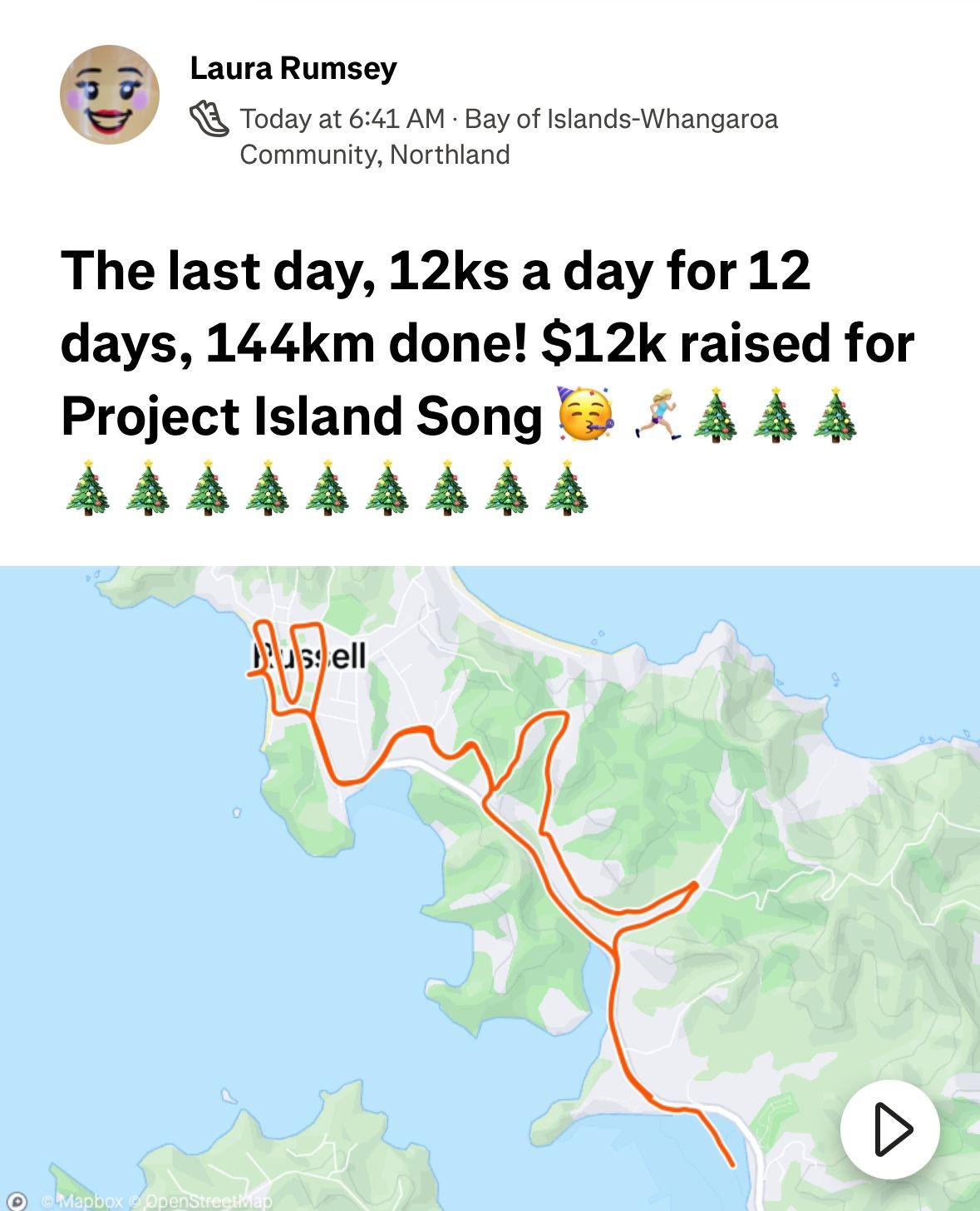 We did it! We’ve completed the 12ks of Christmas Challenge for Project Island Song. Thank you so much for donating. The challenge has exceeded the $12,000 goal with money still coming in, which is incredible, it’s going to make a huge difference in what can be achieved.