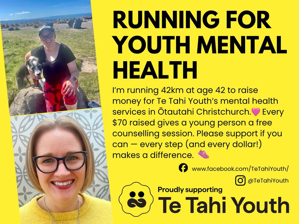 On 15th November, I’ll be running the Queenstown Marathon to raise money for Te Tahi Youth, a Youth Hub here in Ōtautahi Christchurch that provides vital support for young people. I’m fundraising specifically for their mental health services, because this is a cause that’s very close to my heart.