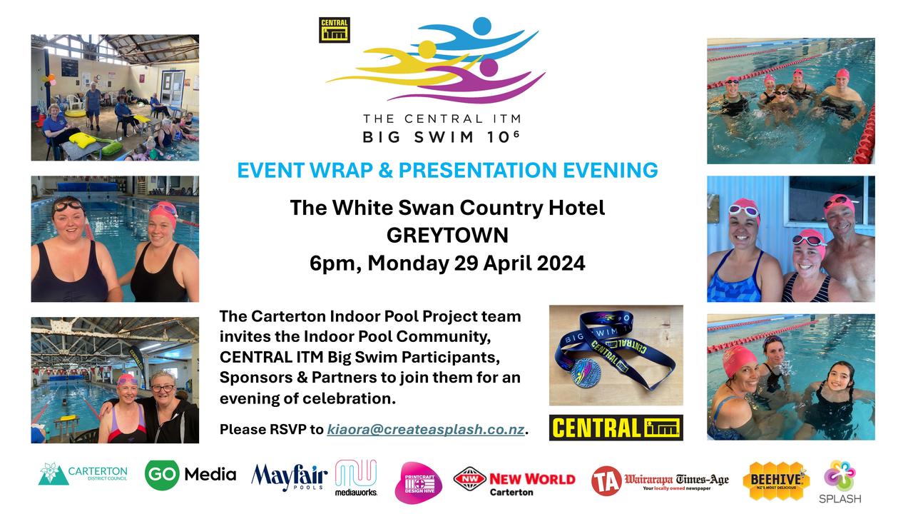 Please join us at 6pm, on Monday 29 April at the White Swan Country Hotel GREYTOWN to celebrate the community’s achievements and connect with the people who are involved with using the Carterton Indoor Pool.
