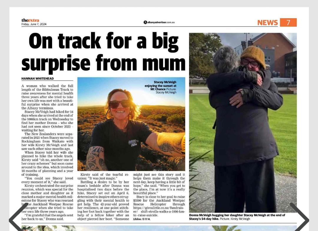 About 5 years ago I had a surgery that didn't go to plan and as a result my nervous system has been seriously damaged. During my recovery things became overwhelming due to the lack of physical activity and immense pain I struggled to fight and couldn't see way through for the first time in my life. As a consequence I tried to take my own life. Through the love of my whanau and the medical help provided I survived. The Westpac rescue helicopter in NZ transported me to a much needed ICU where I began my fight and recovery journey. So I decided a year ago to walk the Bibbulmun track, 1006 end to end south bound journey. This journey is significant in my recovery and something I have dreamed of for sometime. I understand it won't be easy but that's what recovery looks like. So if you are in a situation to donate it would be appreciated. Also maybe just reach out to someone and do a check in, ask open ended questions that require something more than a yes or no