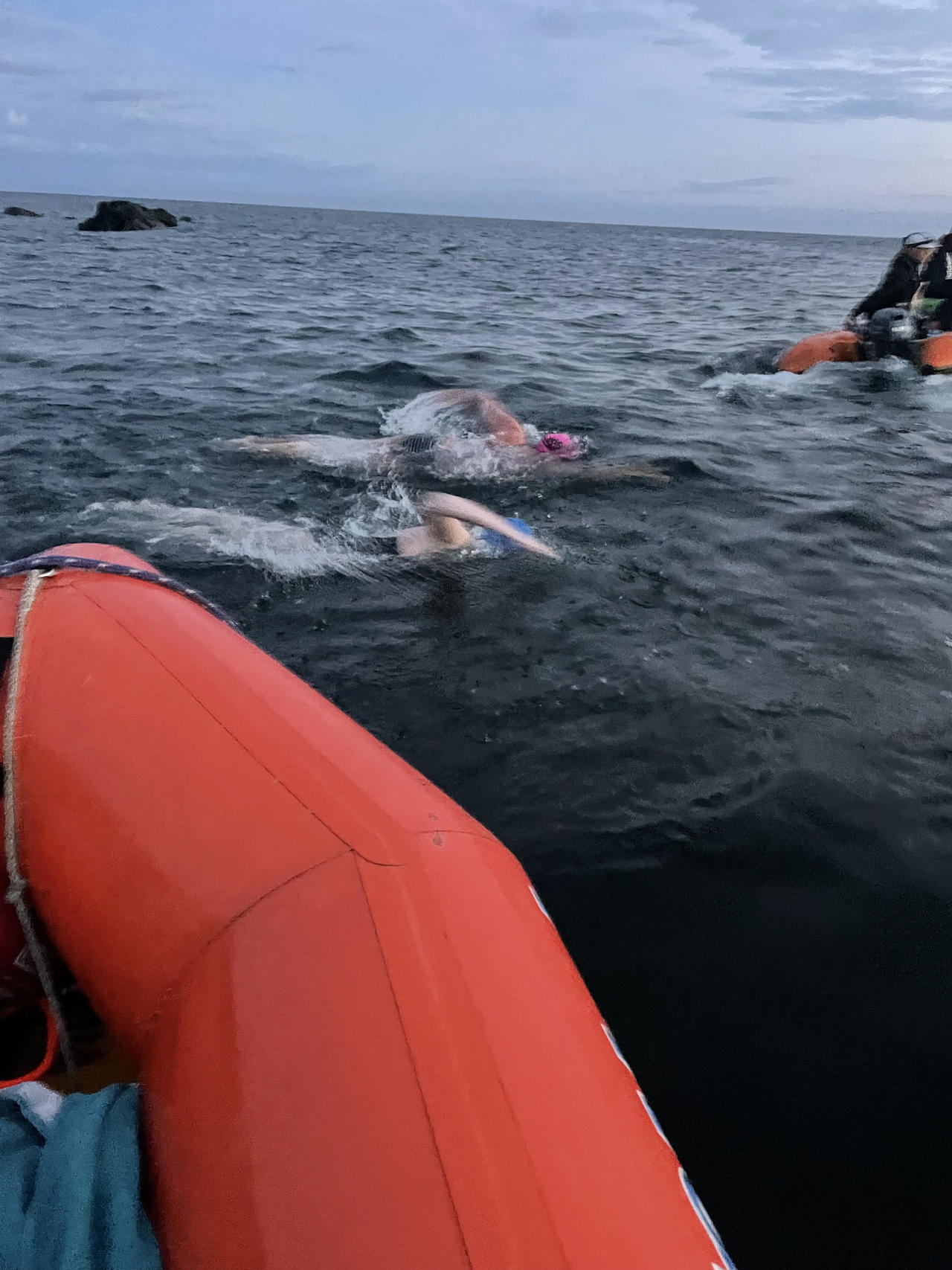 Hi Everyone - Thanks for all the support. We had to dig deep as it was a tough swim but the great cause and all the support kept us going. The conditions started well, swimming into a gorgeous sunrise and we both made good progress for the first five hours. Then fog set in, the tide was running in some strange way our local boat pilots hadnt experienced (and not in our favour), the swell and chop increased. About four hours before we finished the fog lifted as did our hearts as we saw land! However the tide was still against us and we had to battle hard. However some dolphins came to swim with Grainne and Susan had a guardian albatross who kept checking in on her. Susan landed first having spent just under 12 hours in the water and Grainne about 30 minutes later.