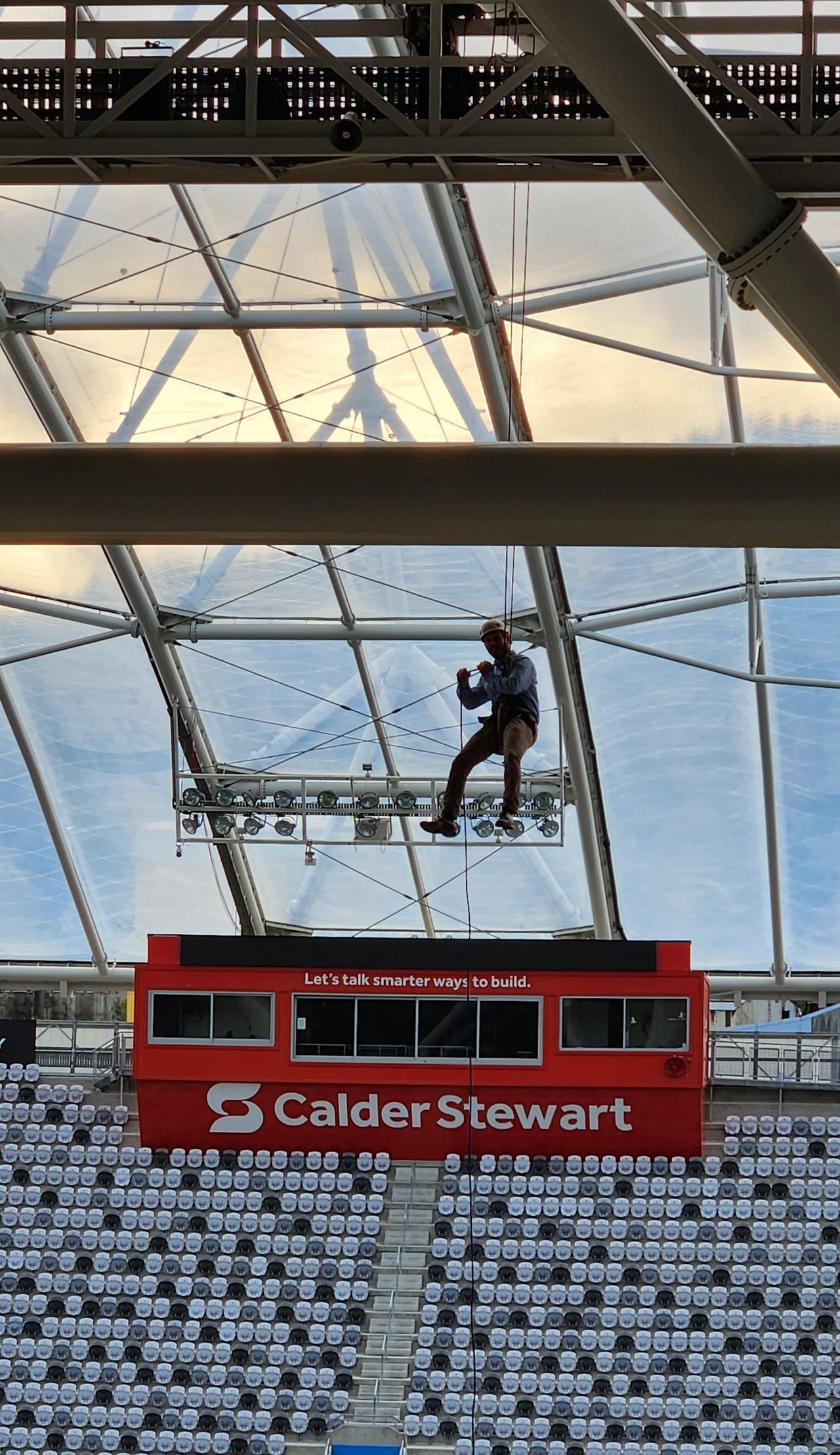 I took part in ‘Toss the Boss’ this morning – abseiling off the gantry at Forsyth Barr stadium with 30 others. It was great fun and quite unnerving stepping over the handrail 35m up.