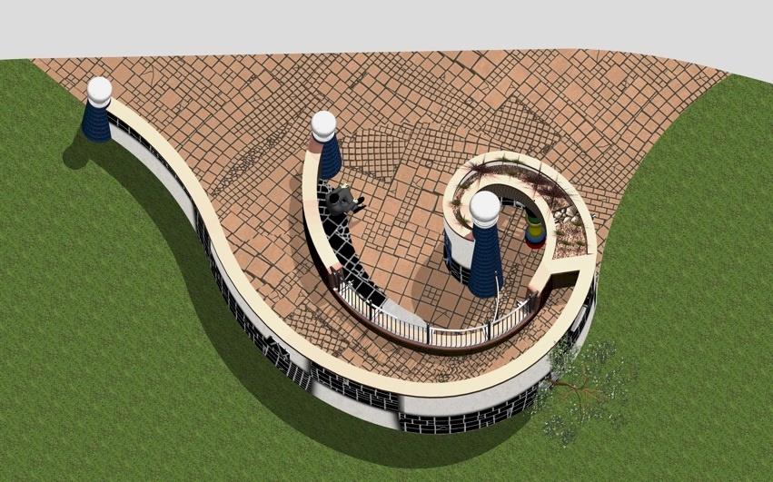 Te Kakano, the seed, is a 5 metre-high ceramic and brick architectural sculpture, based on the koru, a symbol embraced by Hundertwasser. The structure will include seating and a small covered area with a planted roof. In accordance with Hundertwasser's values, local bricks are to be upcycled into the construction The construction will use the building techniques to be applied to the main Hundertwasser Art Centre.