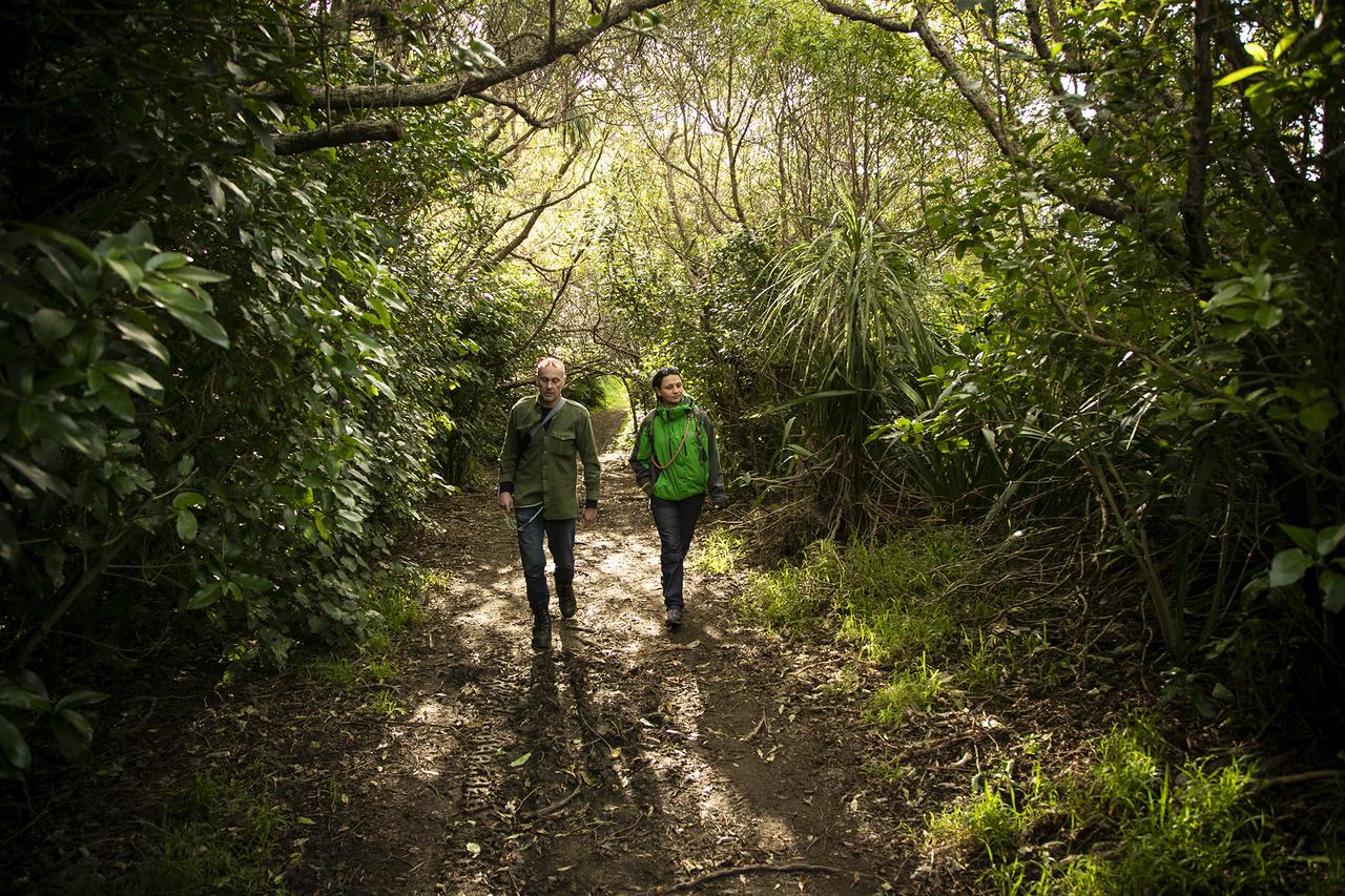 Where there are folds in the hillside with small gullies we can put in things like totara, rewarewa and titoki in the open spots, and under established trees we added nikau, poporokaiwhiri, rata and kohekohe.