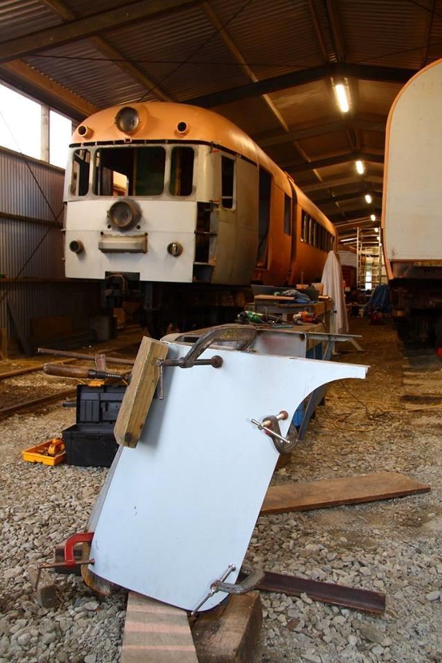10 May 2020The enduring and challenging task of rebuilding Articulated Railcar RM 121 continues to soldier on with a number of significant milestones accomplished and new initiatives underway. The overall general appearance of both car bodies have been taking on further form with the finalisation of cab skin panels, cowcatchers, steps and the continuing fabrication of various elements which all contribute to the all-important goal of a completing a fully operational twinset railcar.