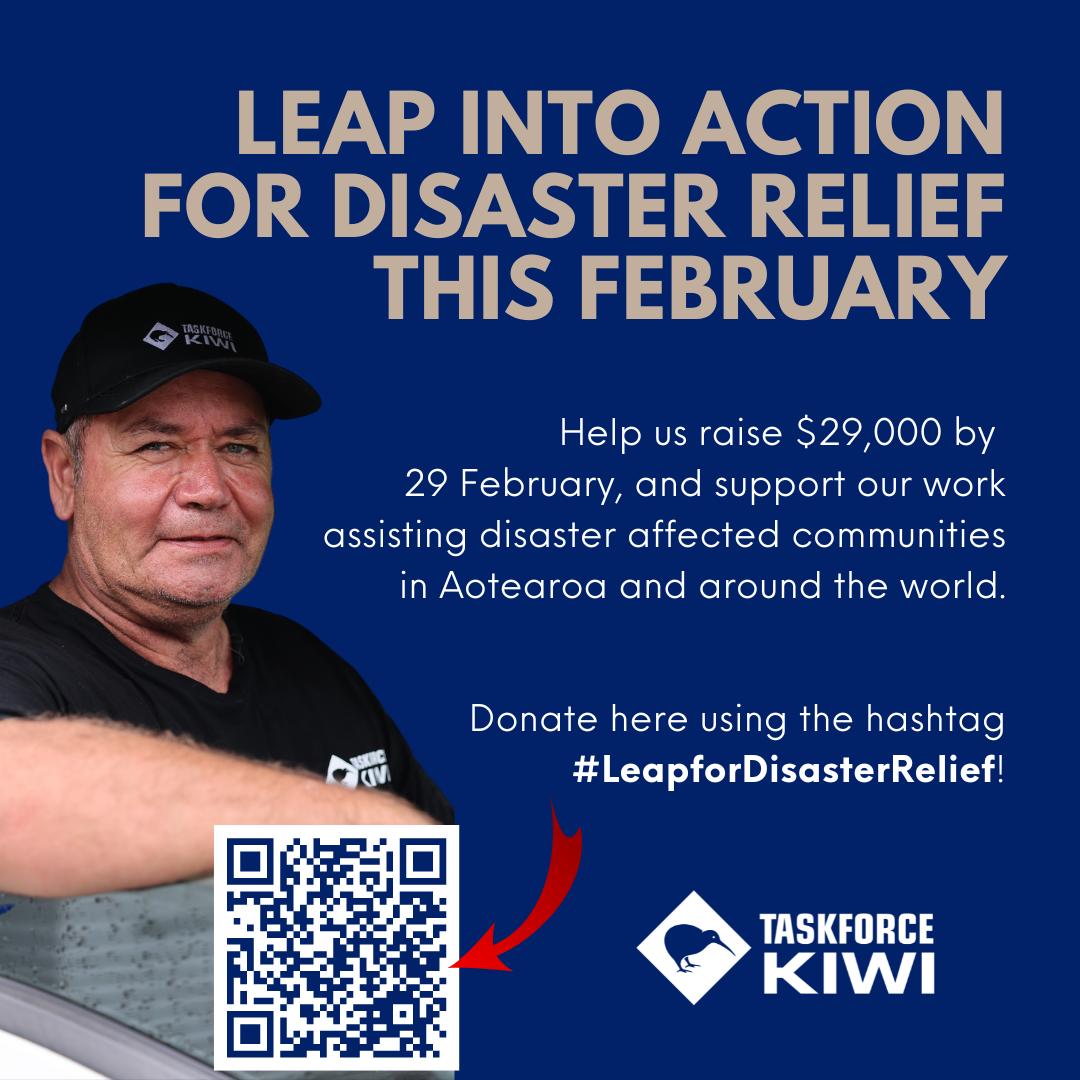 We have set a challenge to raise $29,000 by 29 February 2024 as part of our Leap for Disaster Relief campaign. To contribute, go to https://givealittle.co.nz/org/taskforce-kiwi, and use the hashtag #LeapforDisasterRelief.